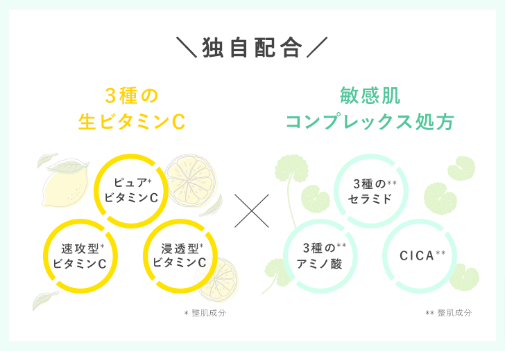 ①3種の生ビタミンC*3 配合 × 敏感肌コンプレックス処方