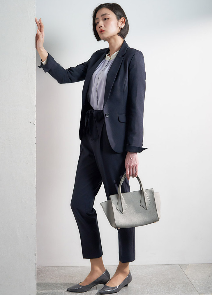 こちらのセットアップ、とても使いやすいです!ジャケット・トップス・パンツそれぞれ単体でも使えて、毎日のコーディネートが困らなくなります。さらに、パンツはリボンでサイズ調整できてカジュアルにもフェミニンにもなれます。セットアップがシンプルだから、カラーものや柄ものも入れやすくて、一気に華やかになります!