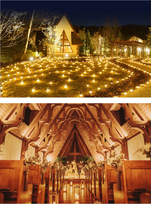 また、毎年ご好評をいただき、冬の風物詩となっている「キャンドルナイト」を今年も開催します。軽井沢の澄んだ夜空にきらめく星々と、約400個のキャンドルが織りなす幻想的な光のコントラストをお楽しみいただけます。さらに、クリスマスシーズン限定の挙式プラン「キャンドルナイトウエディング」も販売中です。二人だけの挙式も承っており、大切な方とともに、幻想的な空間で心に残るひとときをお過ごしいただけます。