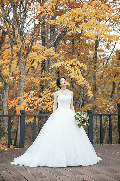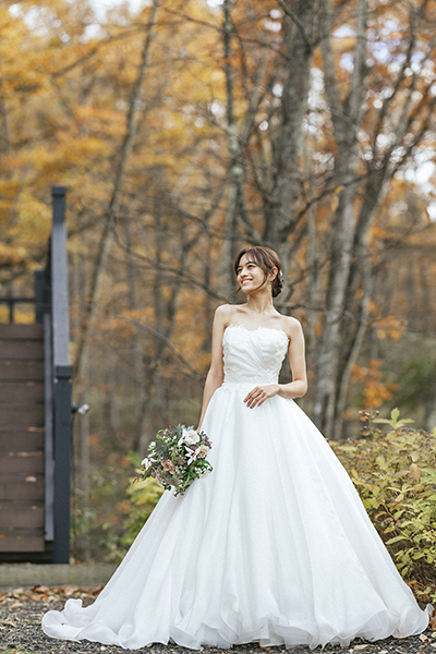 気品あふれるオフショルダーと計算されたドレープが胸元を飾るデザイン。優美に広がるボリューム感のあるスカートが至福の一日を彩る映画のヒロインのような印象的な美しさを届けます。