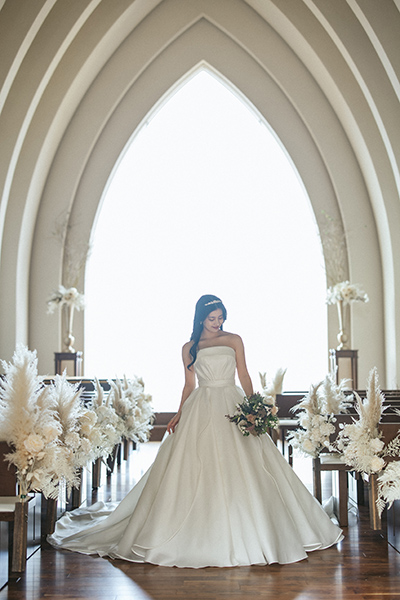クラシカルな王道デザインでありながら、縦のラインを強調するAラインシルエットは誰もが憧れる高貴な品格を纏わせます。時代を超えた美しさを感じさせる花嫁姿を叶えてくれる一着です。