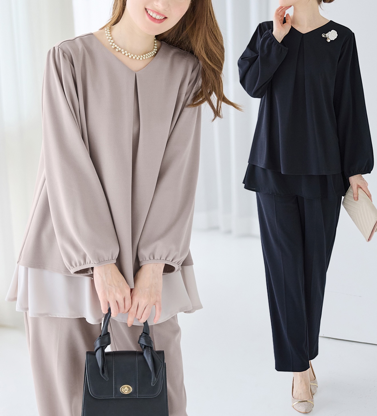 ■特長:軽やかなシフォンジョーゼットを裾からレイヤードさせた上品セットアップ。トップスはお尻まで隠れる丈で、さりげなく体型カバーしながらおしゃれを演出します。パンツはセンタープレス入りで、すっきりとした美脚見えを叶えます。さらに、伸縮性のある軽くしなやかな素材のカットジョーゼットを使用しているため、きれい見えを保ちながら、長時間のセレモニーも快適にお過ごしいただけます。